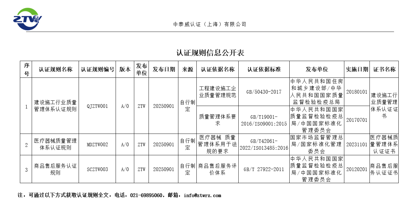 根据国家认证认可监督管理委员会2025年第9号《关于加强认证规则管理的公告》(以下简称“公告”)要求,中泰威认证(上海)有限公司(ZTW)已按照公告要求,将相关认证规则在“认证认可业务信息统一上报平台”完成备案。
